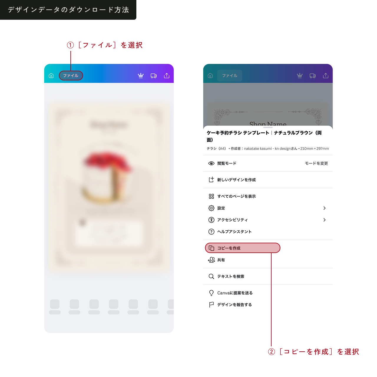 PDF記載のリンクを開き[ファイル]→[コピーを複製]の手順でご自身のCanvaに複製してご利用ください。